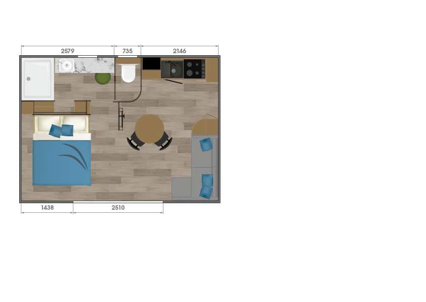 All the touches you’d expect in a hotel suite are included in this mobile home with a cosy living room and a kitchen.