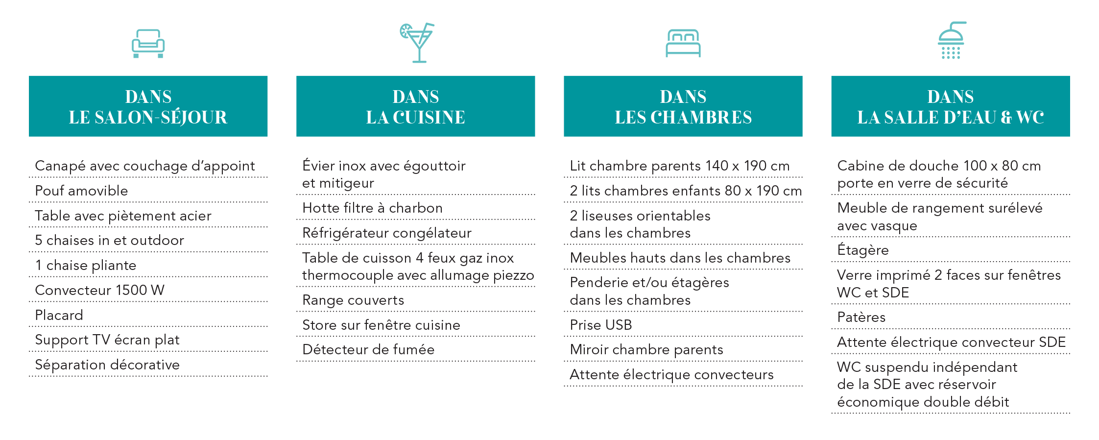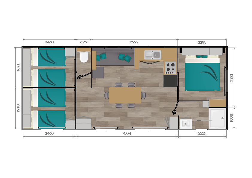 The contemporary kitchen is arranged in the shape of an "L” and opens onto a very large living room. There is plenty of storage space distributed across the different living areas.