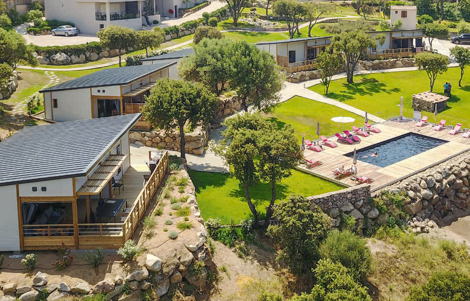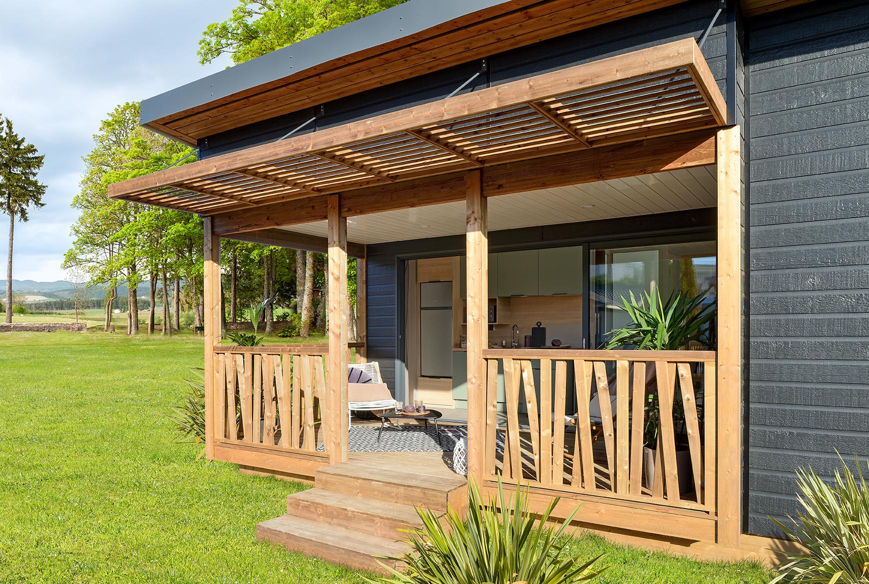 Orientée vers l’extérieur, la cuisine de ce chalet donne directement accès à la terrasse qui devient une pièce à part, un lieu de protection et de convivialité. Les modèles proposent une implantation dans la largeur de la parcelle qui conviendra aussi parfaitement aux installations en restanque. L’intérieur des chalets laisse place à la liberté, au confort et à la lumière avec des espaces conçus pour favoriser la fluidité de circulation, des ameublements solides et des teintes de chêne et d'eucalyptus qui se marient pour former un mélange lumineux.