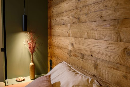 La terrasse en angle est couverte et permet de se protéger du soleil. La pièce de vie spacieuse s’ouvre sur la grande terrasse pour profiter du paysage. La grande chambre parentale favorise la circulation en toute liberté.
