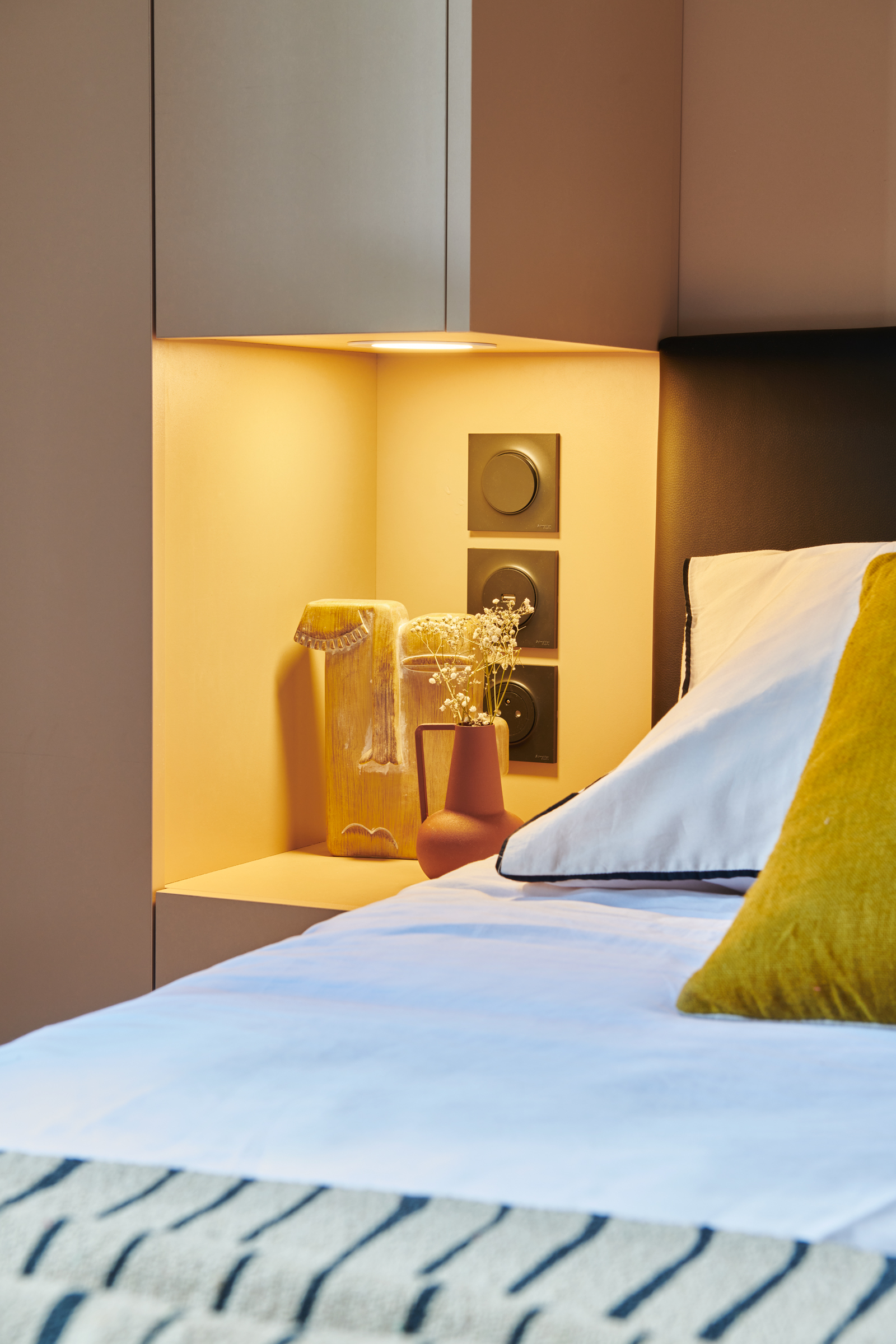 La sélection d’un sol au motif discret dans les tons de gris ciment installe une atmosphère calme et rassurante largement baignée de lumière grâce aux grandes baies vitrées. Toujours en quête d’espace, notre challenge a été d’amplifier cette impression de volume en proposant une très belle hauteur sous plafond à 2.30 m. Ce volume permet de dévoiler à la fois de grandes chambres et une pièce de vie spacieuse, de proposer des portes de communication et une douche toute hauteur, et de créer de nombreux rangements pour maximiser leur capacité, tout en apportant du style aux pièces.