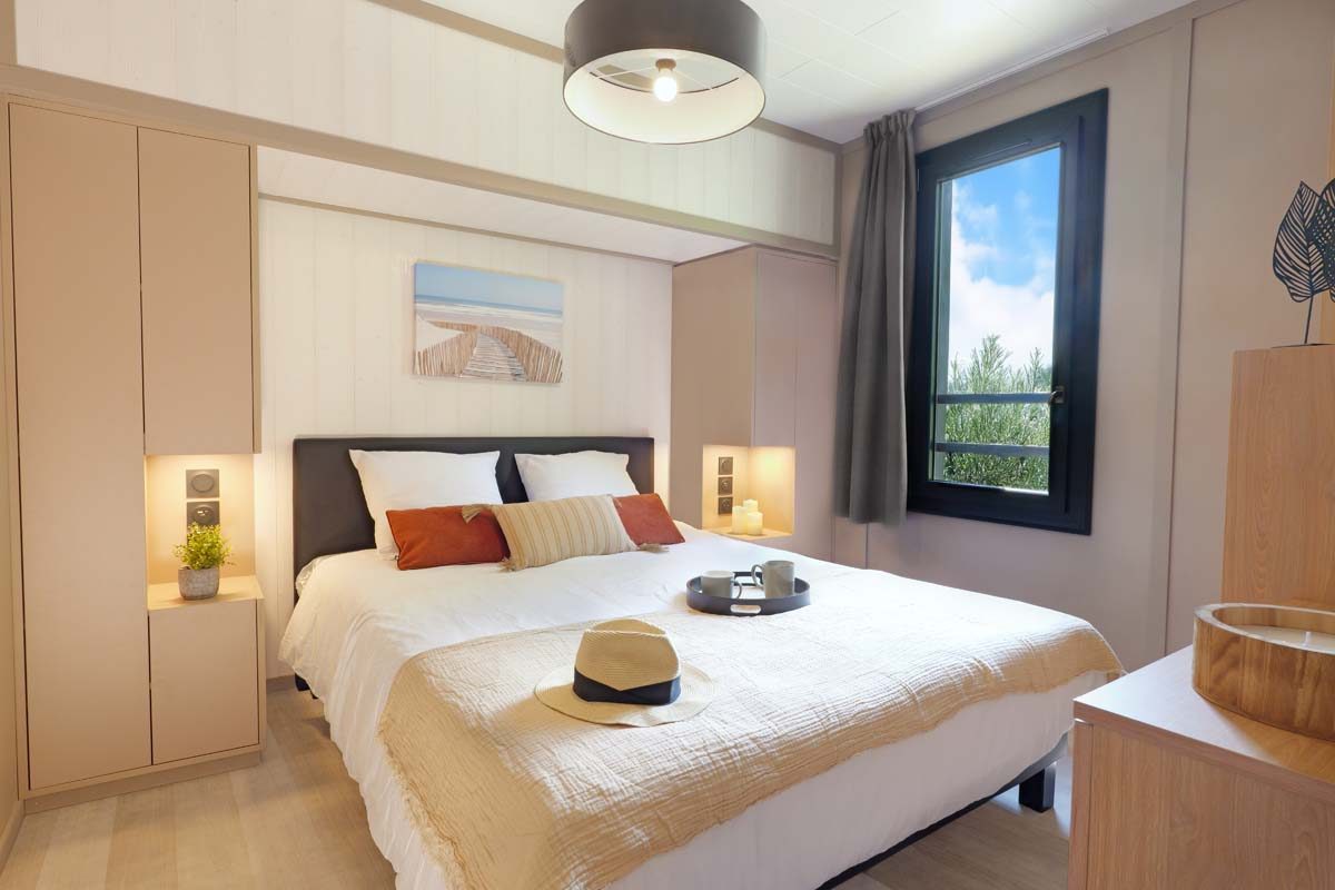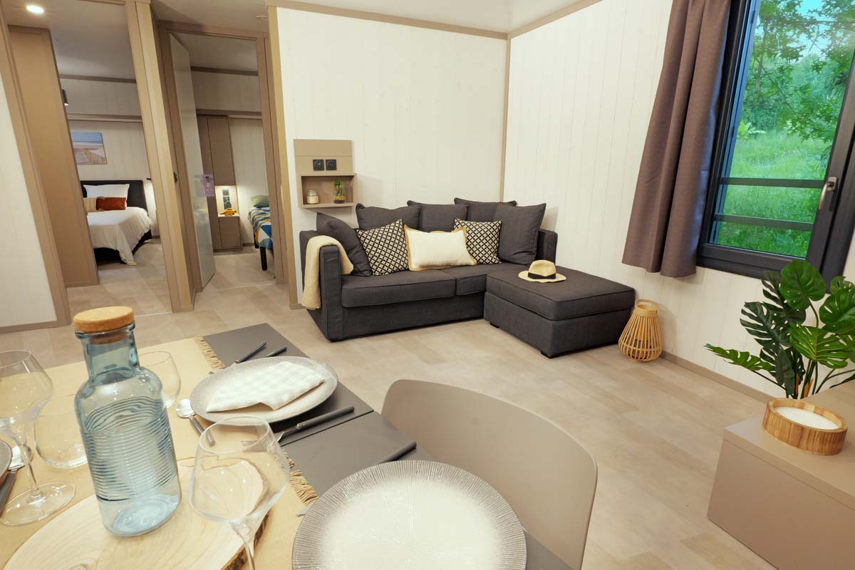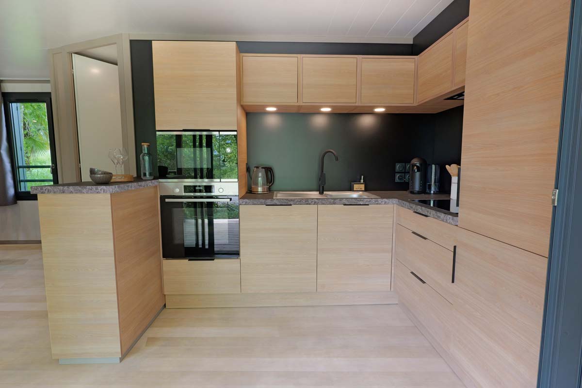 Entrez dans un univers où le sens du détail, la qualité des matériaux et les équipements s’associent pour créer un environnement chaleureux. La douceur naturelle provient du chêne clair des cloisons, des étagères, des chevets et des nombreux rangements. Par le jeu des contrastes de teintes, les touches de noir de la cuisine ou de la tête de lit et le gris de la table ou du canapé dynamisent l’aménagement des chalets.