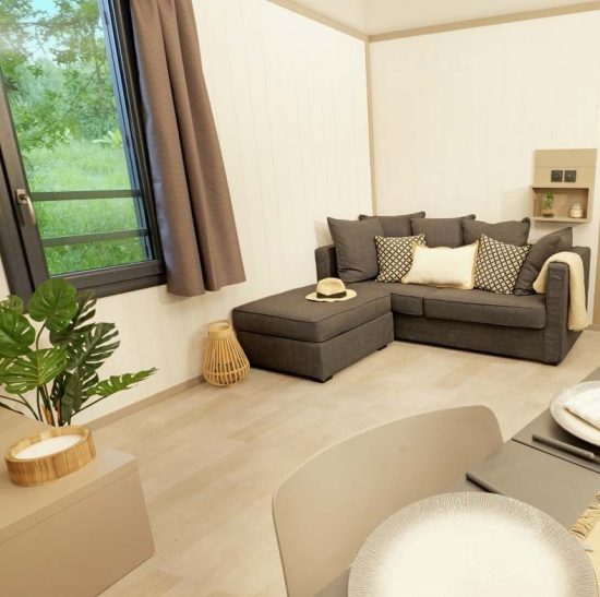 La terrasse couverte prolonge la pièce de vie. Le dressing bien pensé vient créer un vrai plus pour ce chalet !