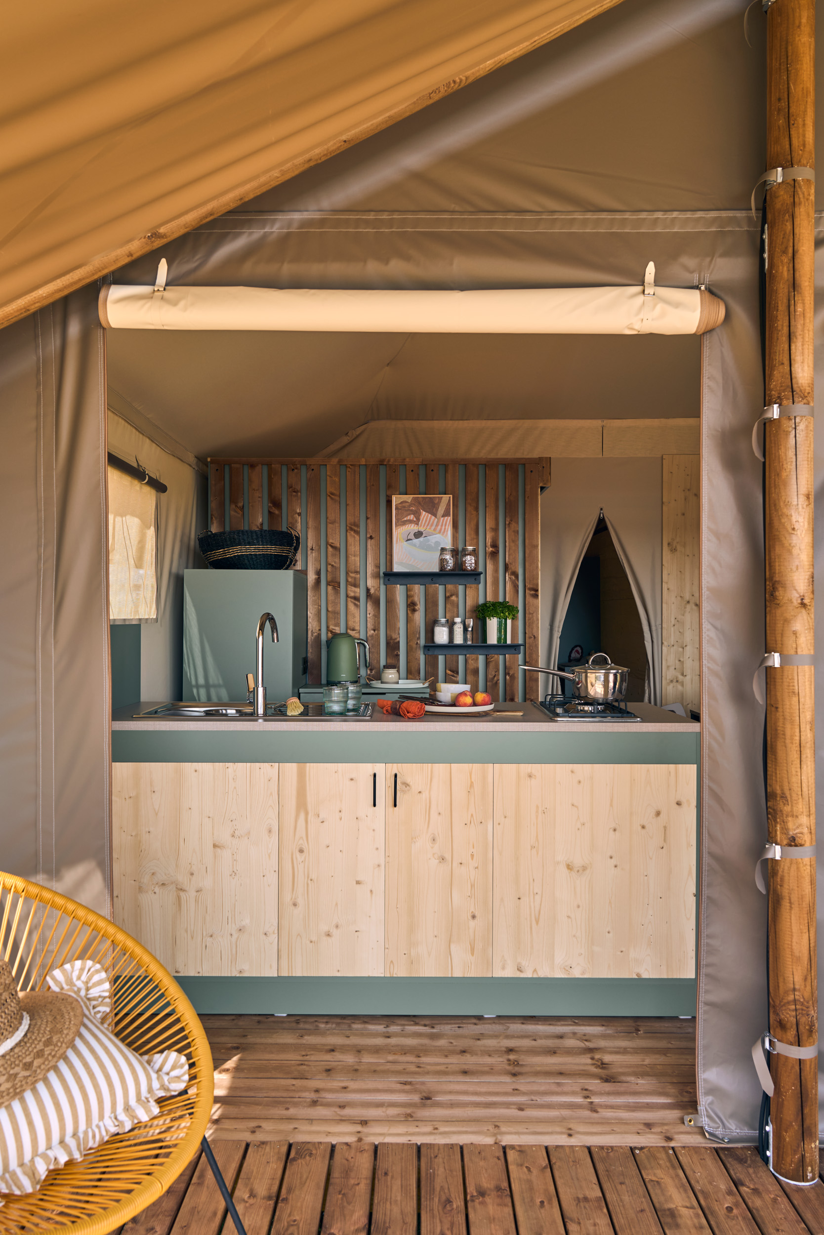 Le bois tient une place dominante parmi les matériaux intérieurs et constitue avec la toile un combo harmonieux et luxueux. La pièce de vie et les meubles en bois jouent avec les matières pour donner du caractère à la décoration et inviter à vivre une expérience glamping. La cuisine est composée d’une structure en bois avec des rangements ouverts. Le plan de travail vient poser le cadre de cette décoration soignée.