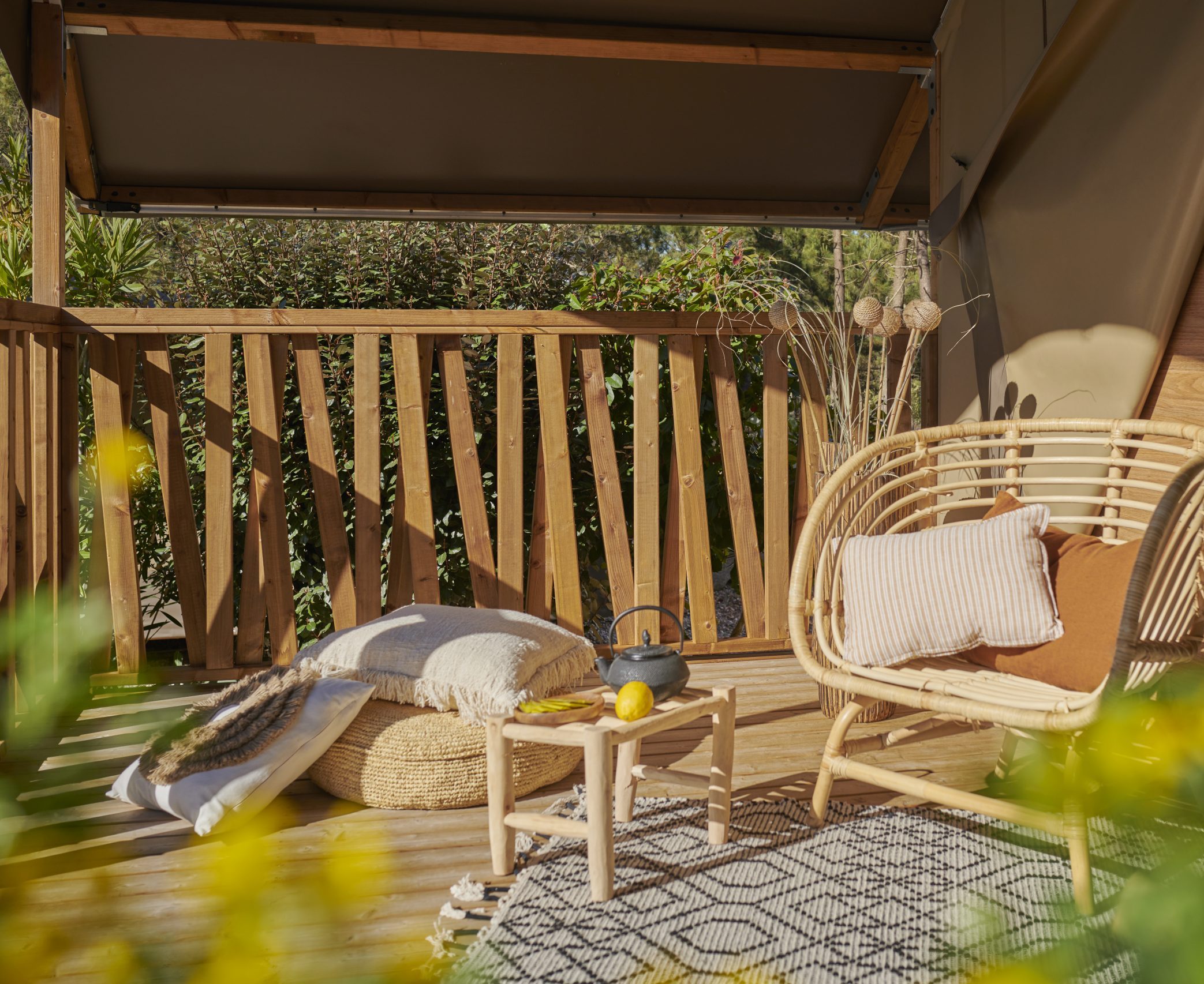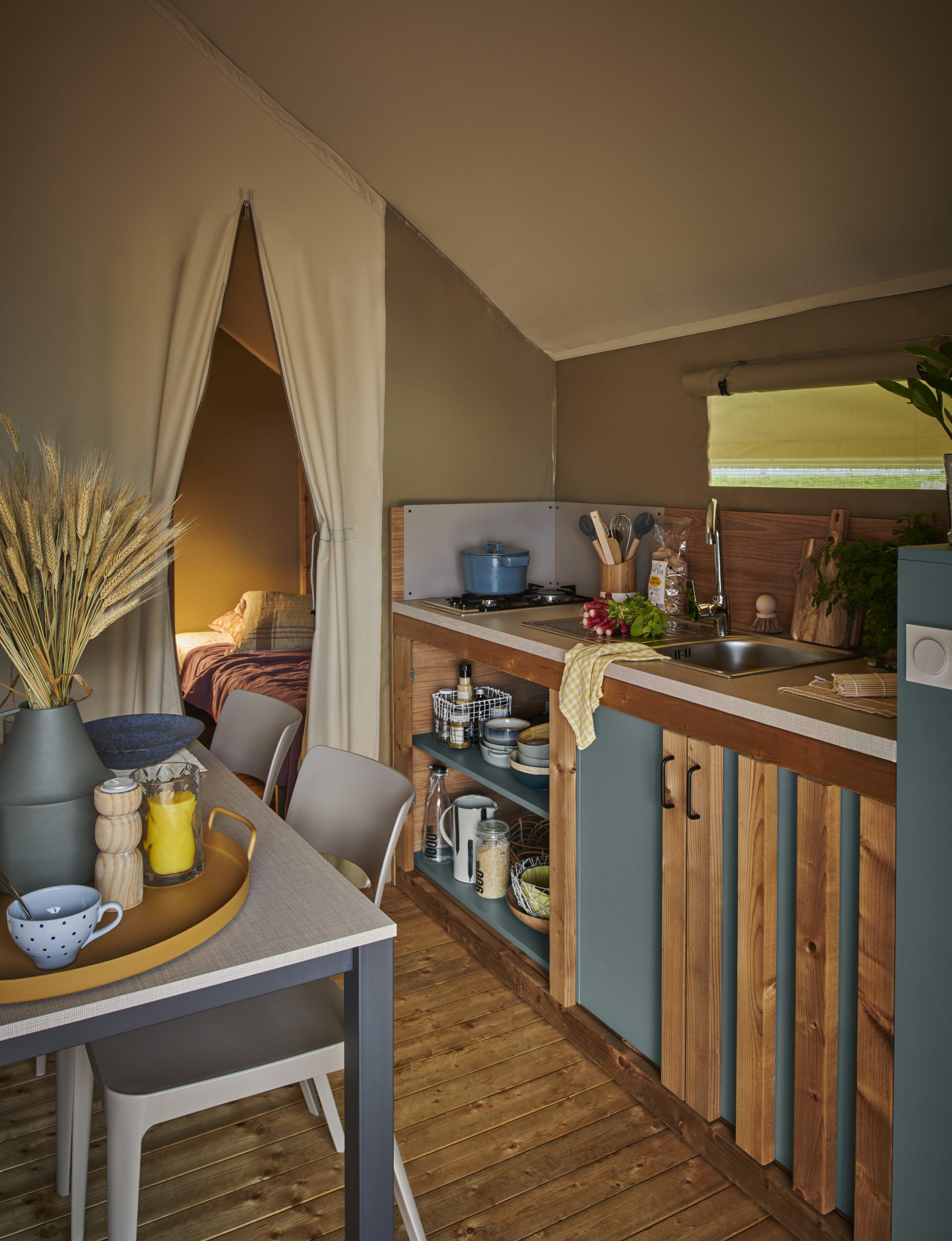 Pour vous offrir un maximum de confort, les lodges de la gamme Mini Wood ont été conçus avec une attention particulière portée à l'optimisation des espaces à travers nos choix d'ameublement et l’agencement des pièces pour plus de confort et de praticité. La hauteur sous plafond et la très large ouverture à l’entrée du lodge font de la pièce de vie un lieu baigné de lumière et illustrent le concept de vie « dedans-dehors ». Les couleurs naturelles et chaudes, le bois, les luminaires et la toile créent une ambiance harmonieuse et chaleureuse.