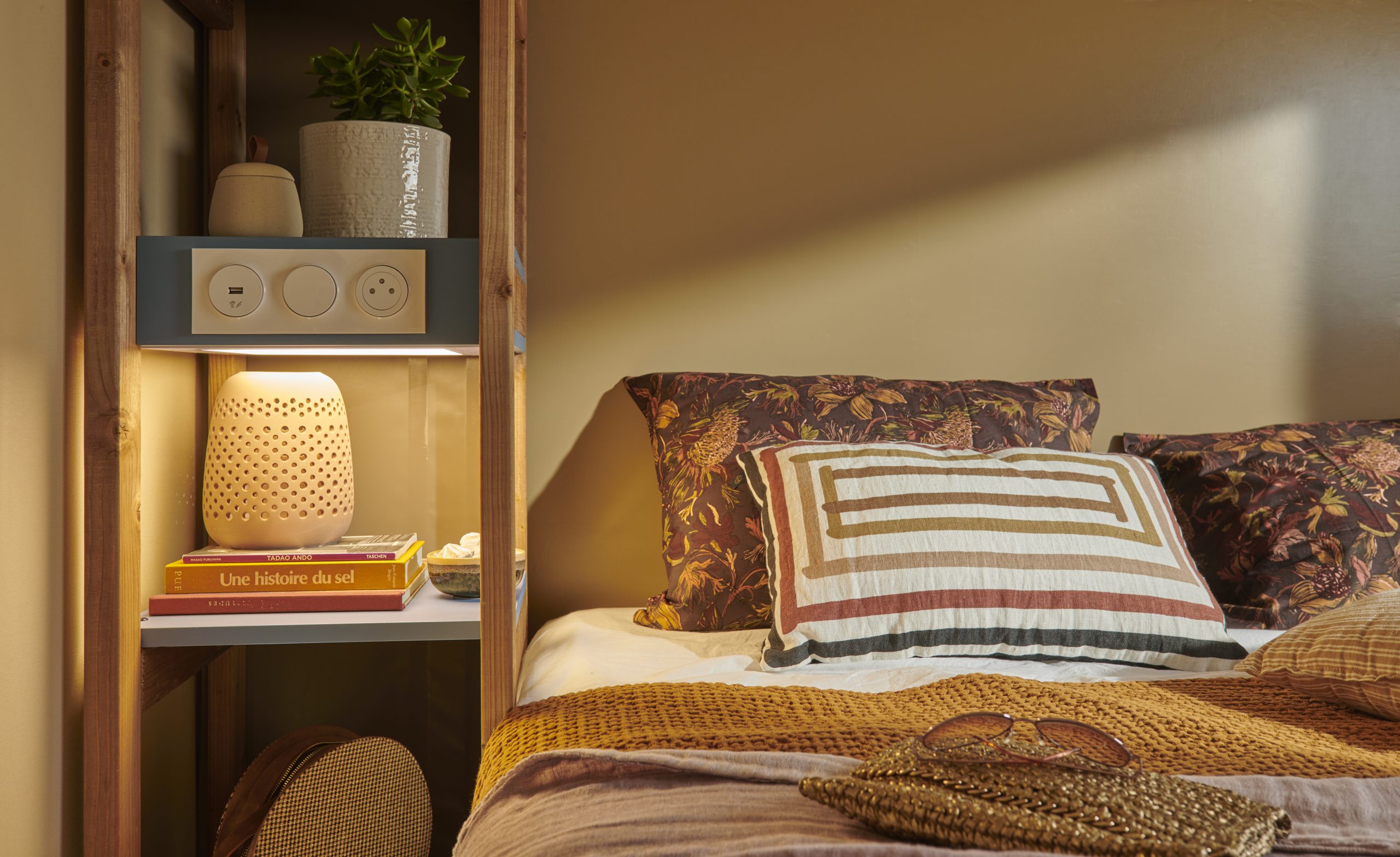 Le bois et la toile se marient pour créer une ambiance cocooning et les couleurs chaudes apportent beaucoup de douceur aux pièces intérieures.