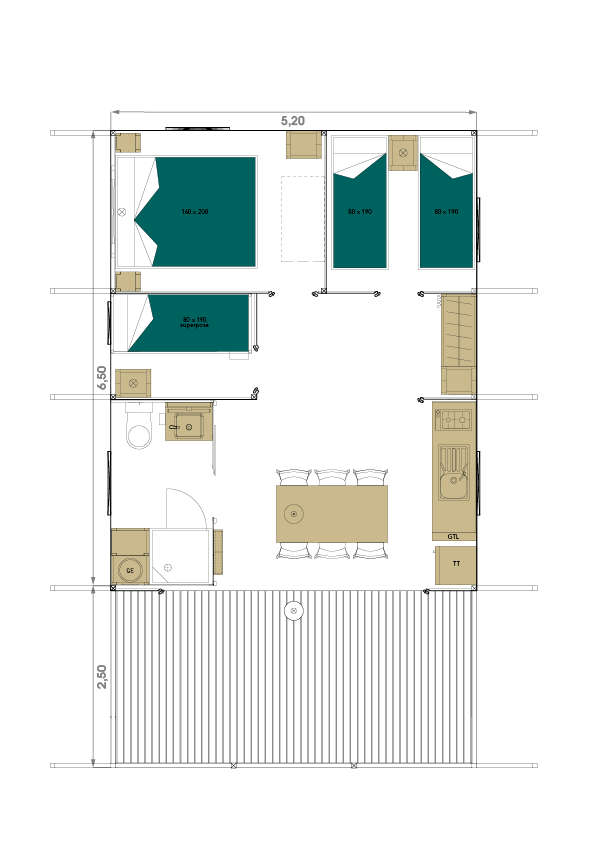 Confortable et spacieux, ce modèle est idéal pour les familles nombreuses ou les groupes d’amis, la salle d'eau est très pratique et spacieuse.