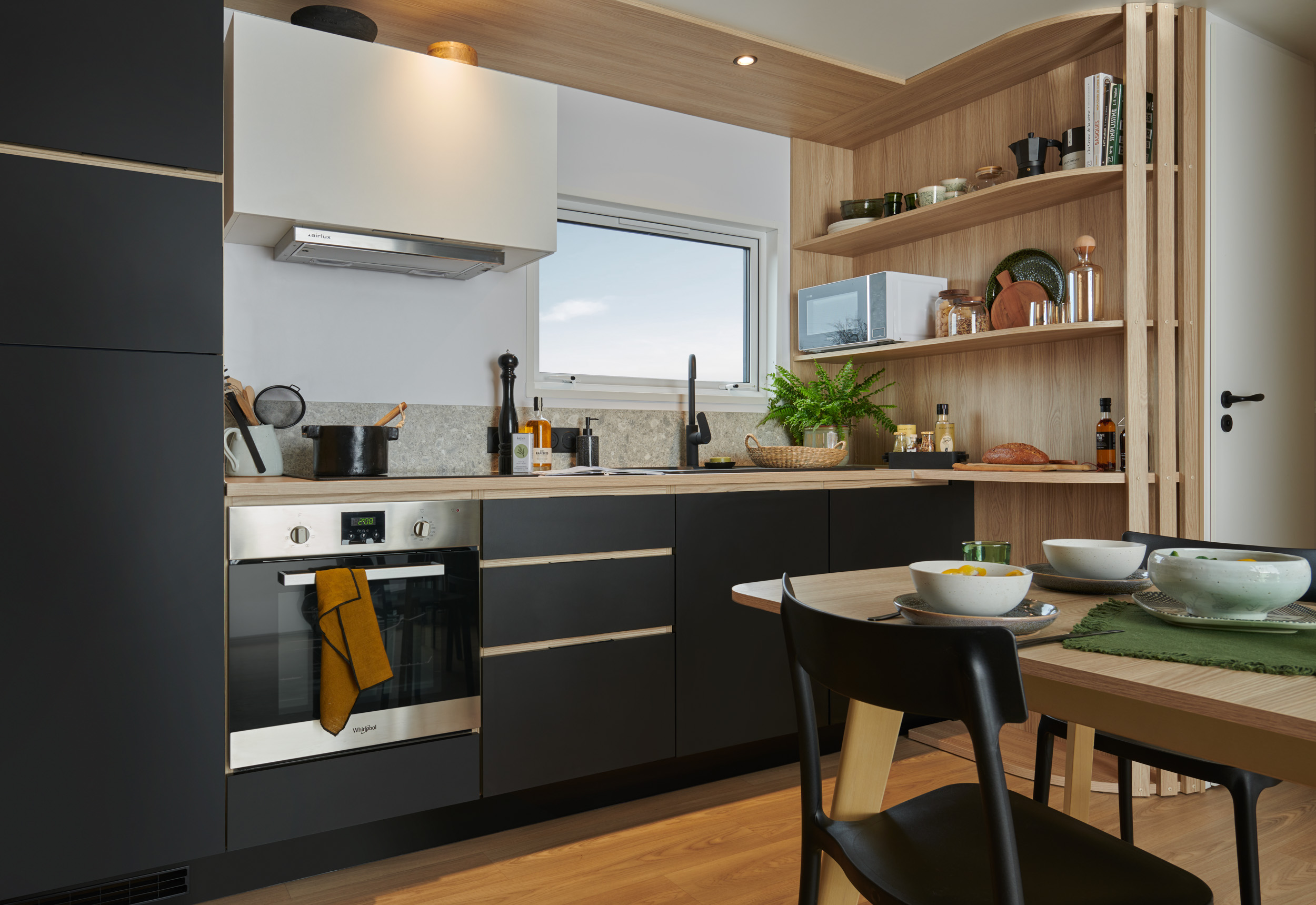 L’aménagement du mobil-home Taos fait la part belle à la fluidité et à l’espace à travers un séjour ouvert qui offre une nouvelle perspective, du volume et de l’espace.