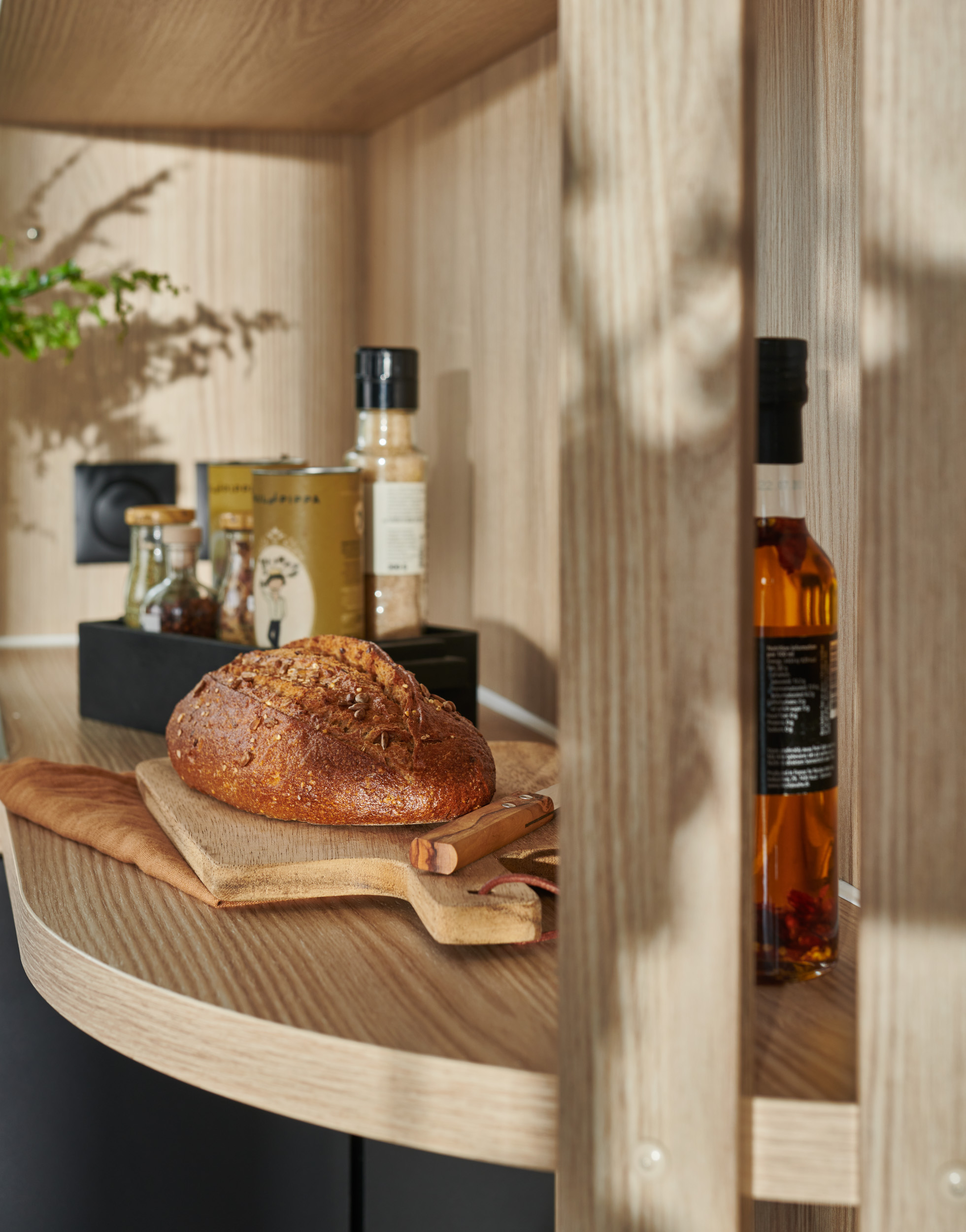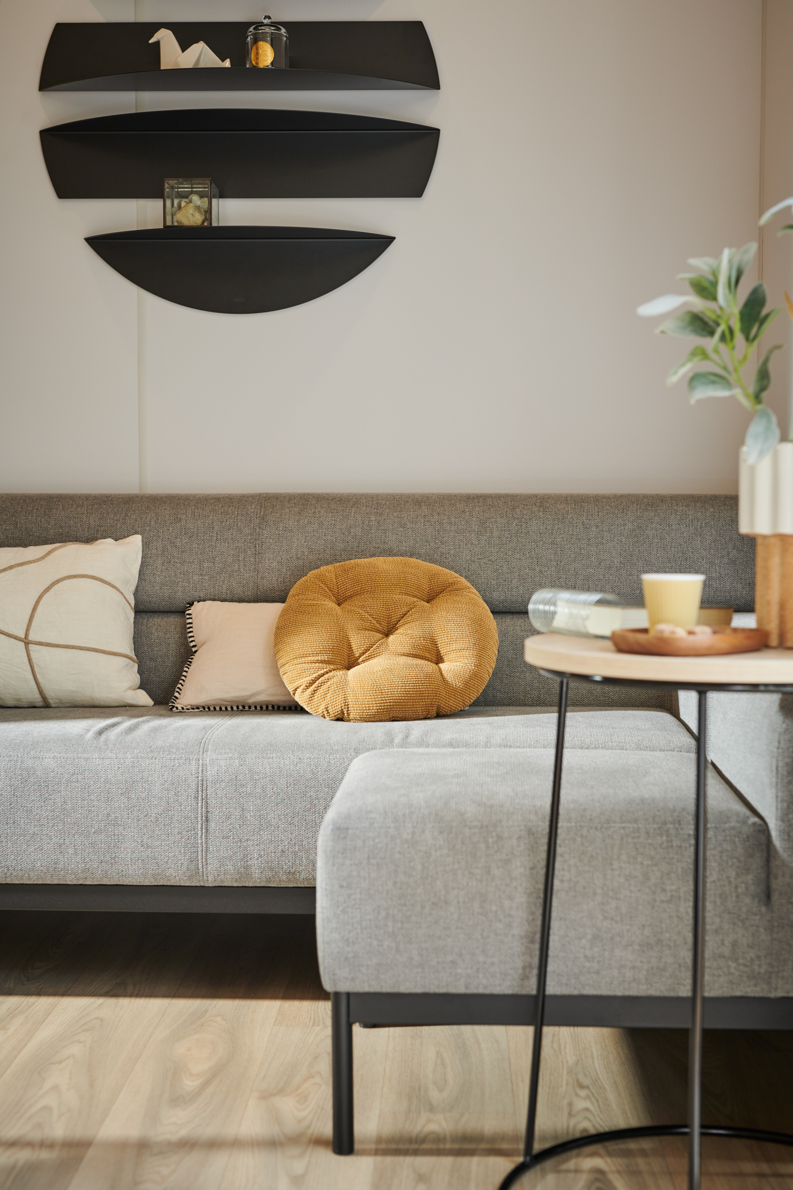 La cuisine design avec banquette intégrée possède de nombreux rangements pour toujours plus de praticité. Le salon, lieu de prédilection pour se détendre et s’amuser en famille, apporte confort et ingéniosité avec un canapé convertible, un totem qui permet de regarder la télévision sous tous les angles, ainsi que des rideaux toute hauteur pour apporter de la chaleur.