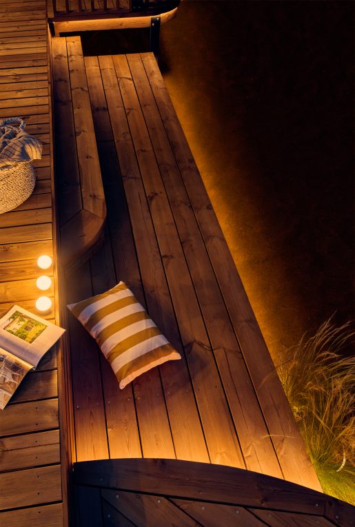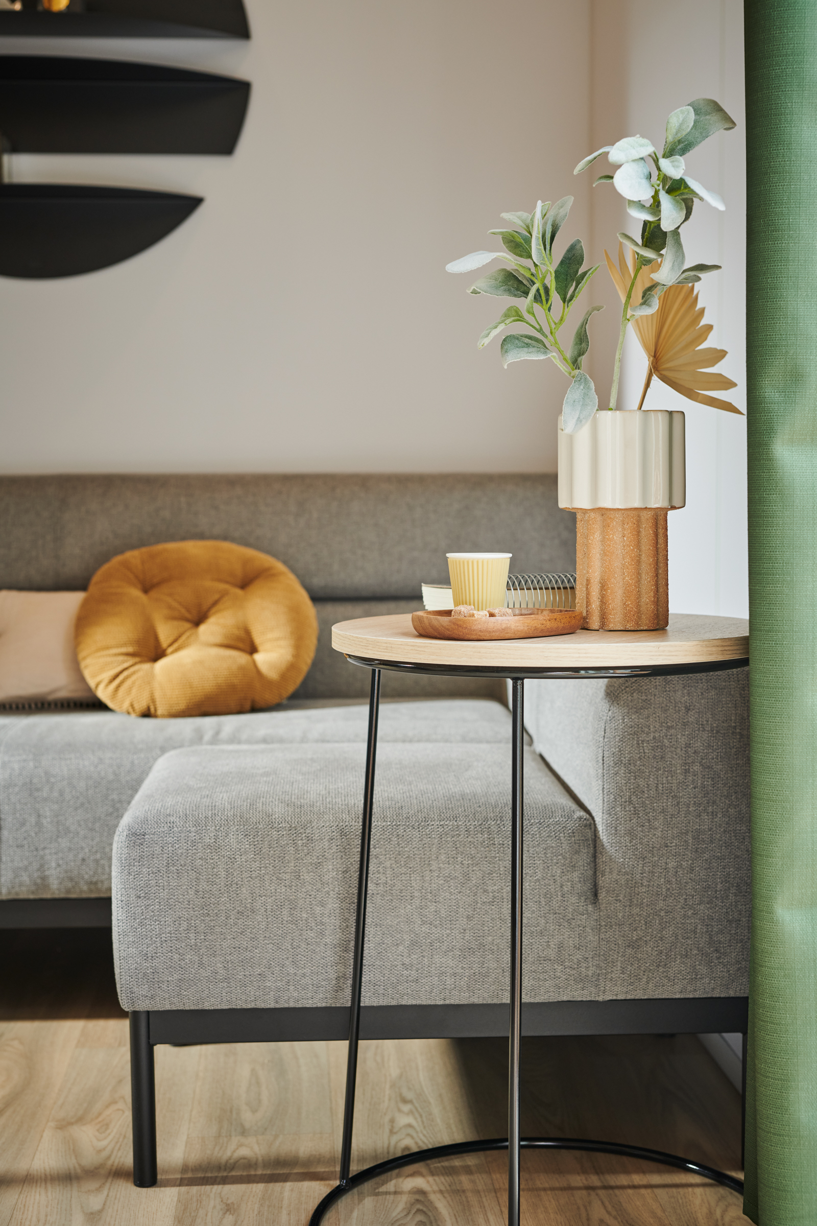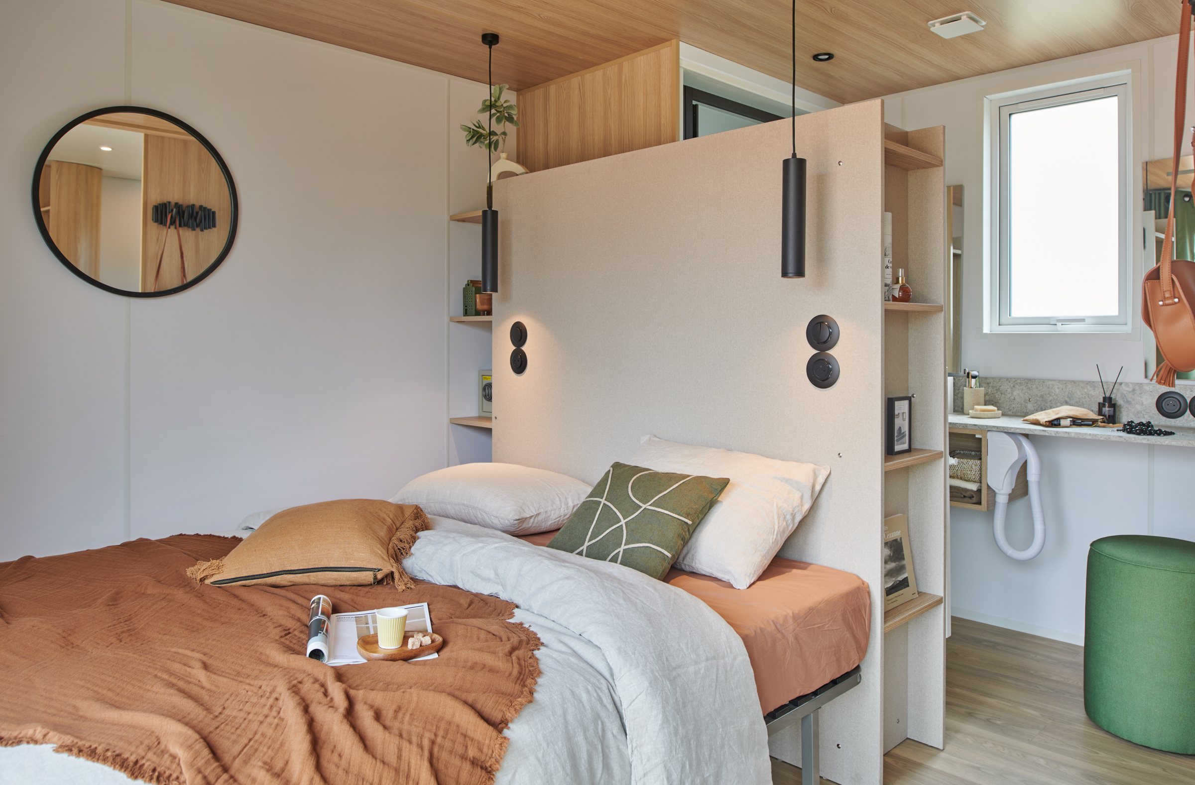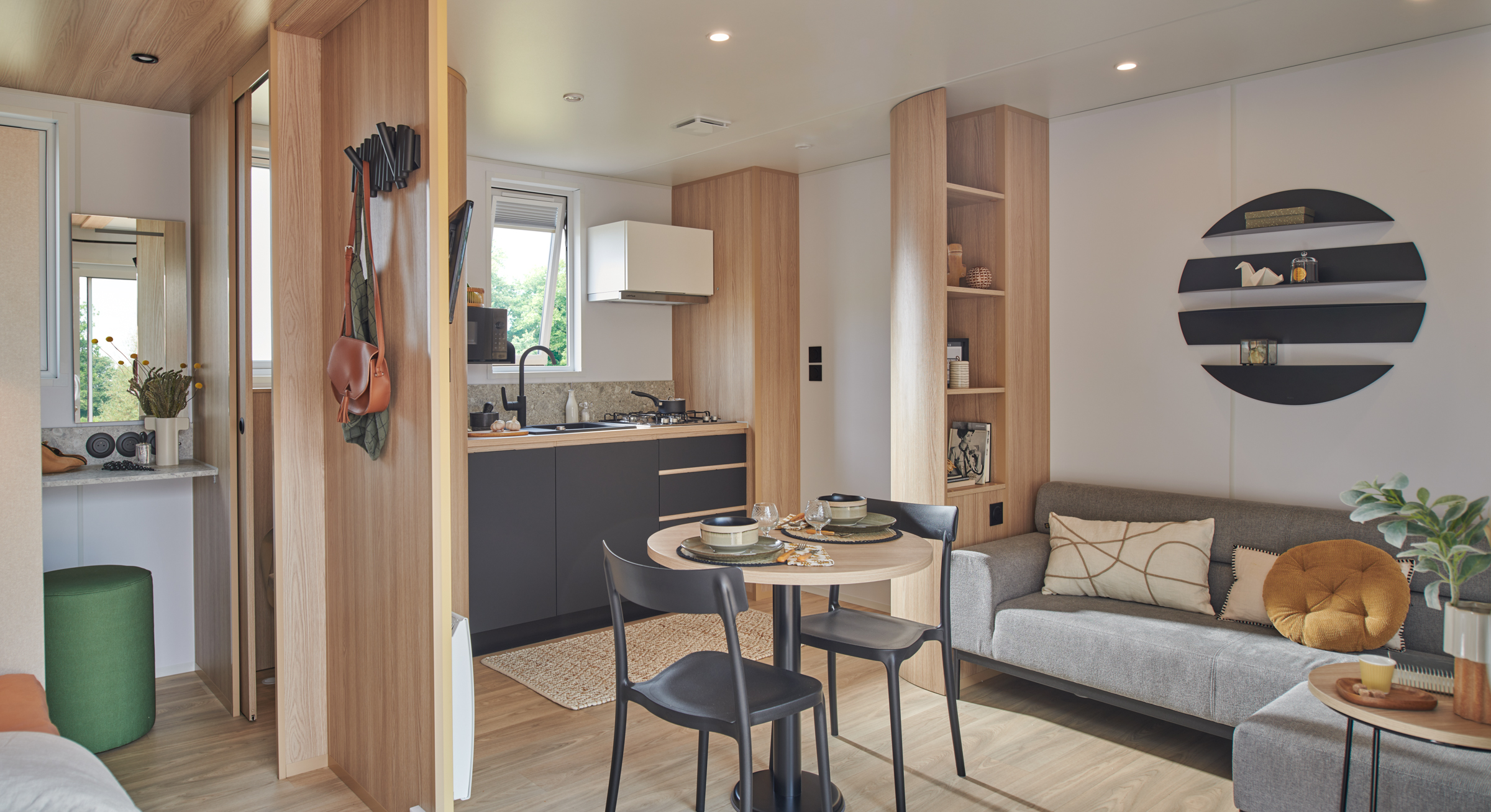 Tous les codes d’une suite d’hôtel sont réunis dans ce mobil-home avec un salon cosy et une cuisine en plus.