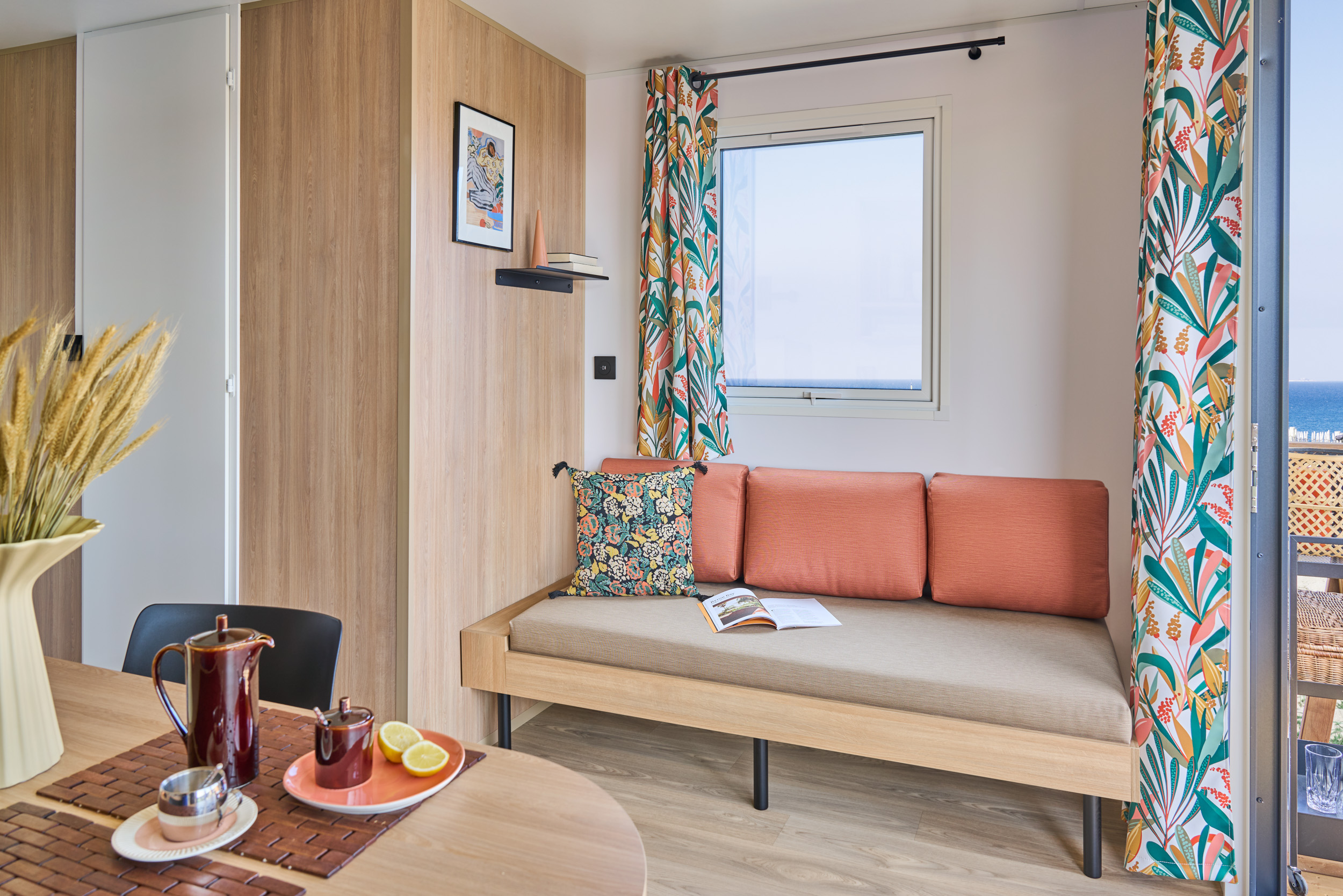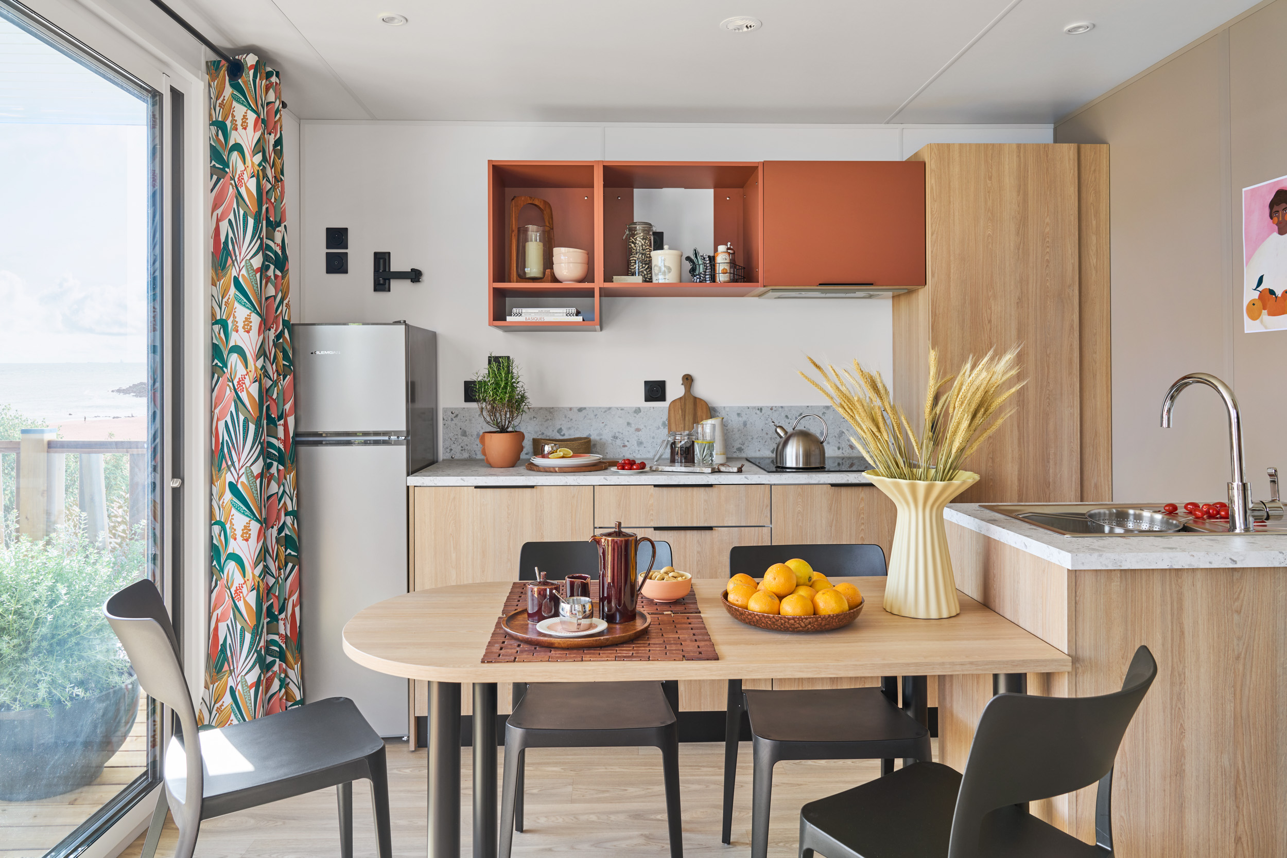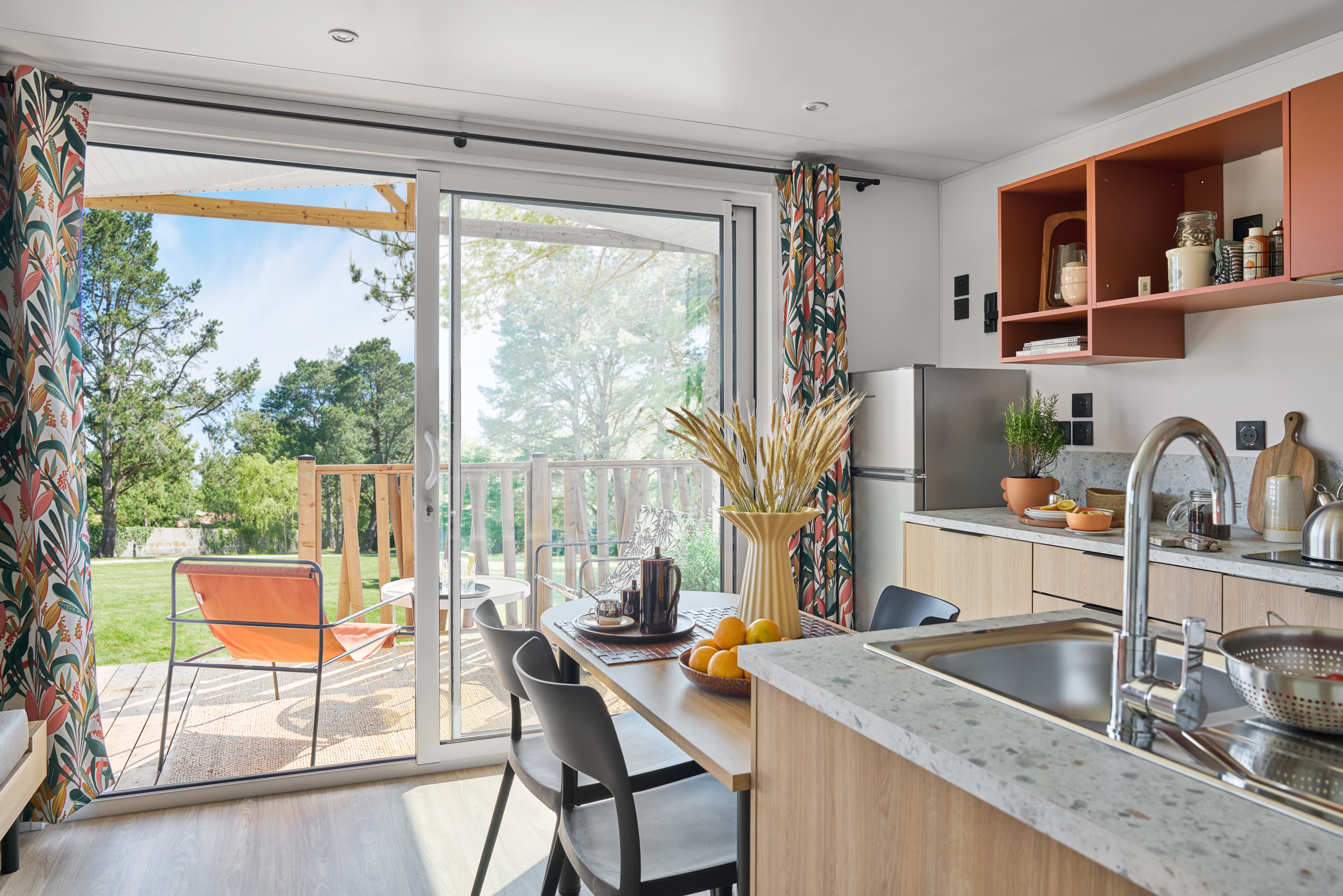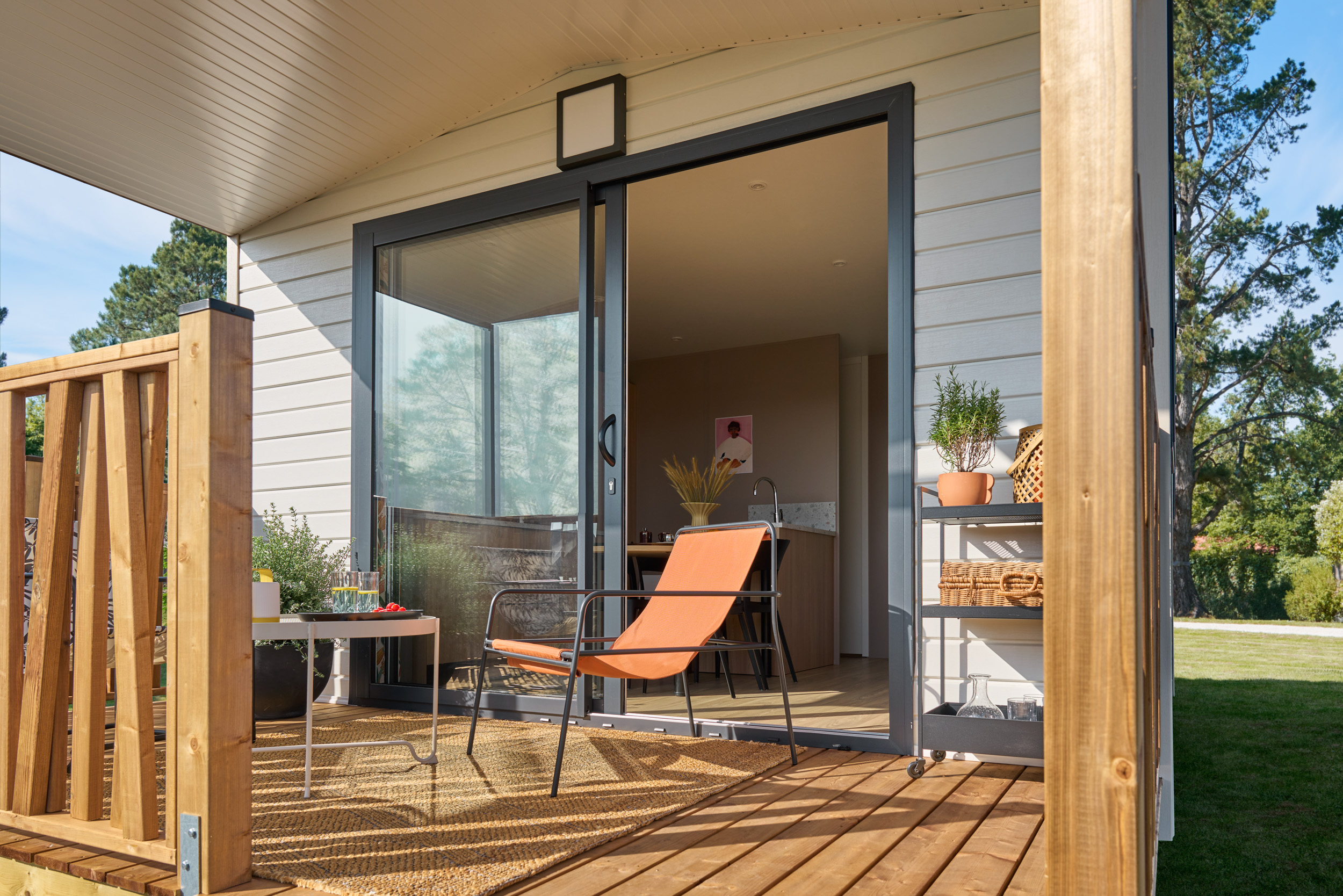 Un sas sépare la pièce nuit de la pièce de vie, la terrasse intégrée permet de profiter de l’extérieur avec une grande ouverture sur pignon.