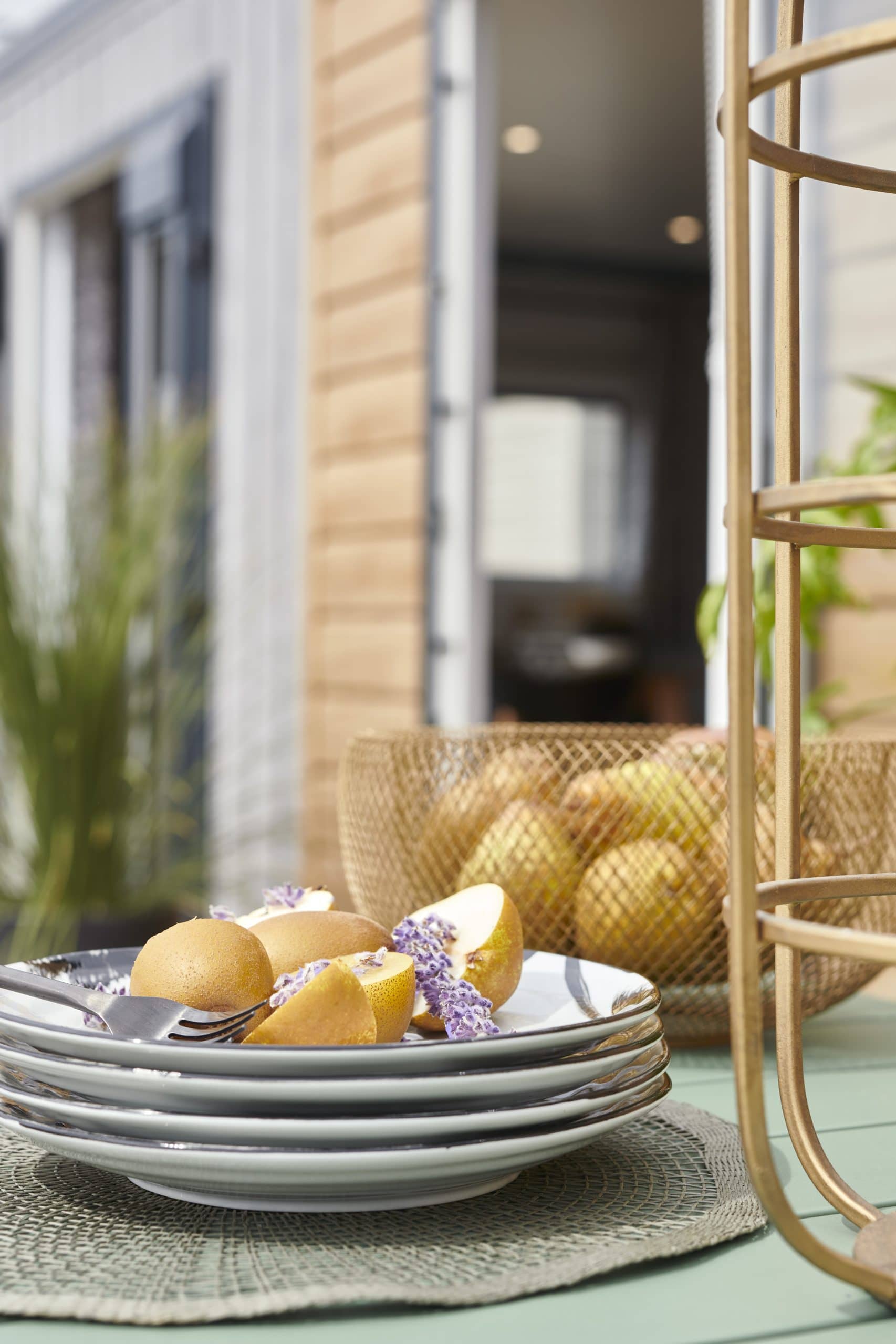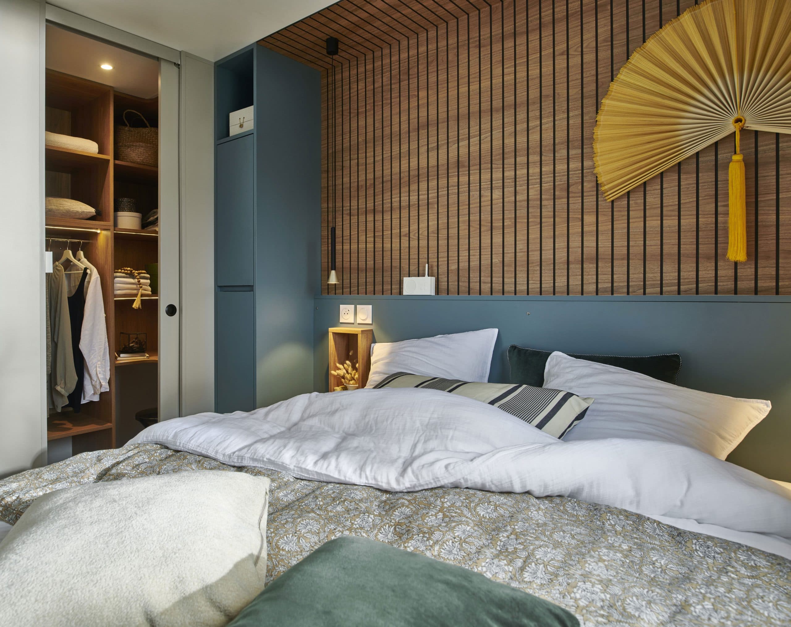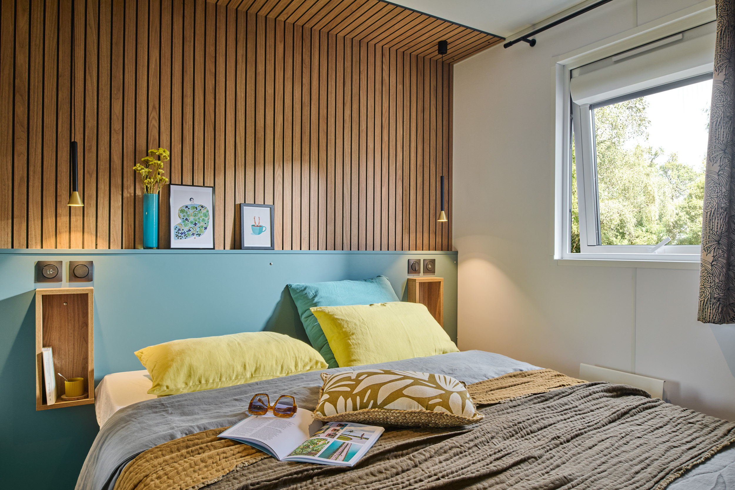 Le séjour bordé de grandes baies vitrées offre une sublime luminosité et donne le sentiment d’un lieu très aéré et spacieux. La cuisine est ouverte directement sur la terrasse ce qui est d’une grande praticité et induit une grande simplicité au quotidien. Les deux espaces « nuit » sont séparés de l’espace de vie de façon nette pour garantir un meilleur confort. Les espaces de rangement ne viennent pas à manquer dans ce mobil-home résidentiel Louisiane, comme entre autres le magnifique dressing dont est dotée la suite parentale.